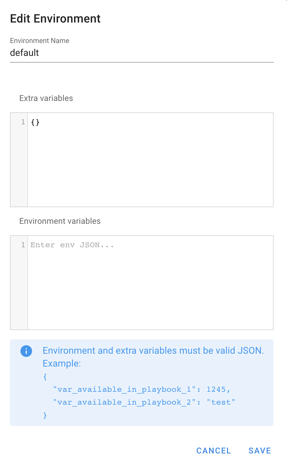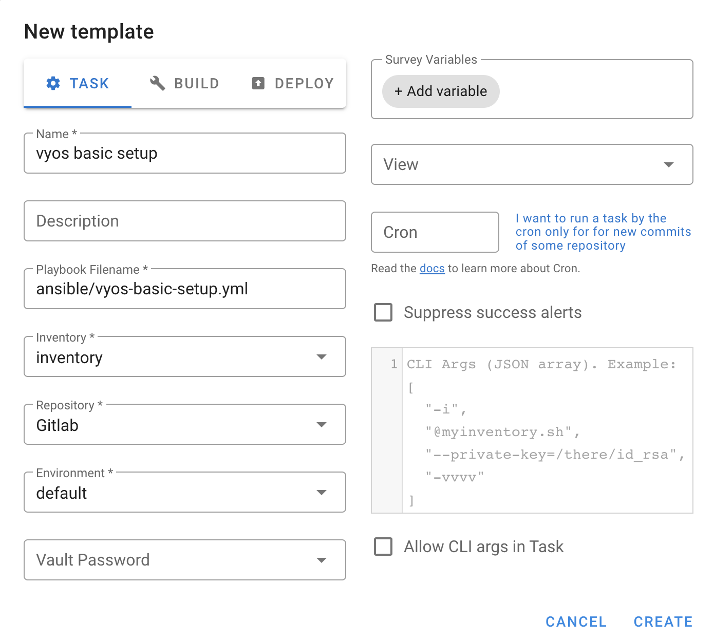 - Select values for inventory, repository, environment as setup in previous steps.